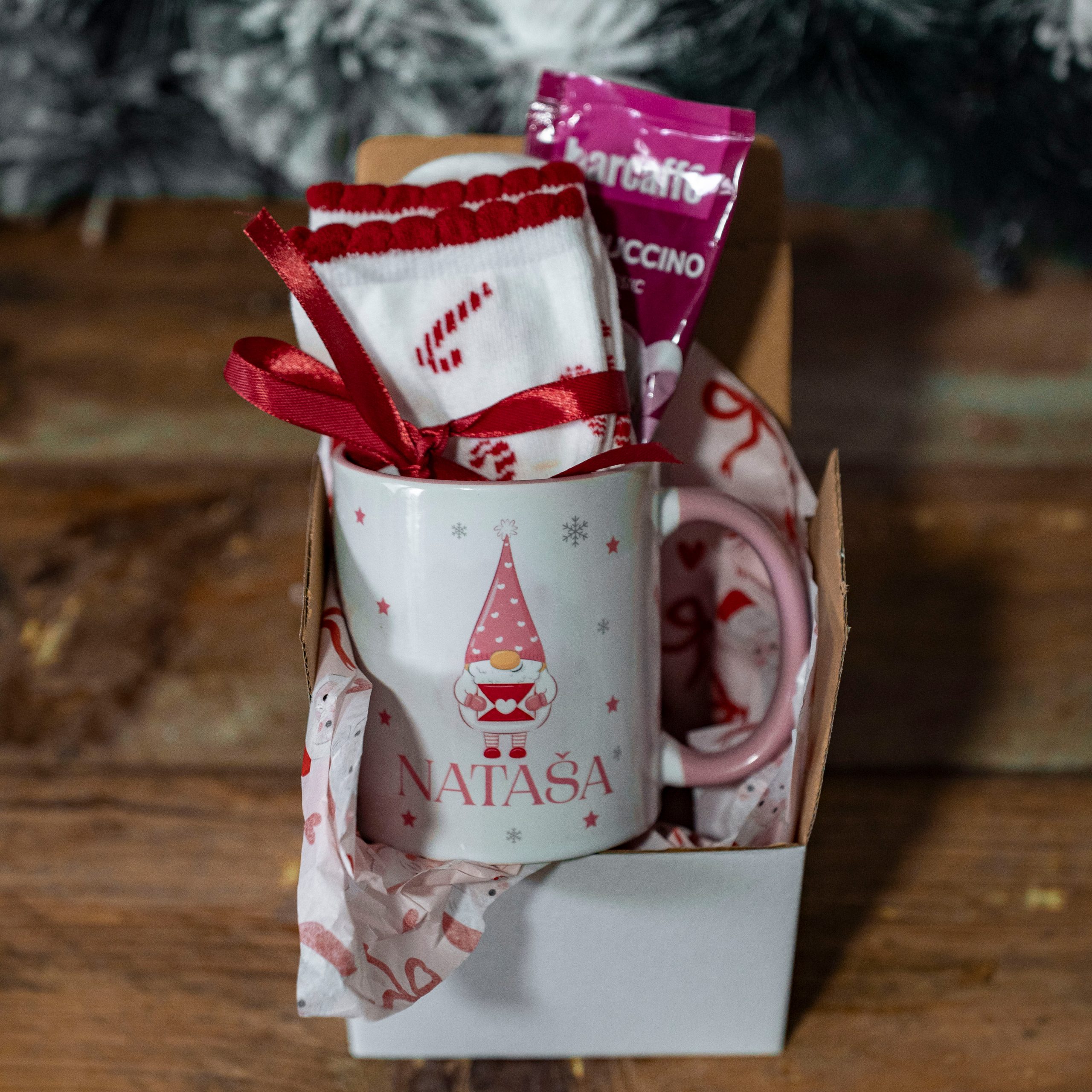 Mini praznični poklon set sa personalizovanom šoljom, cappuccinom i čarapicama. Savršeno praznično pakovanje za poklon za mamu, sestru, koleginicu ili Secret Santa razmenu. Dostupno u roze i crvenoj varijanti ručke.