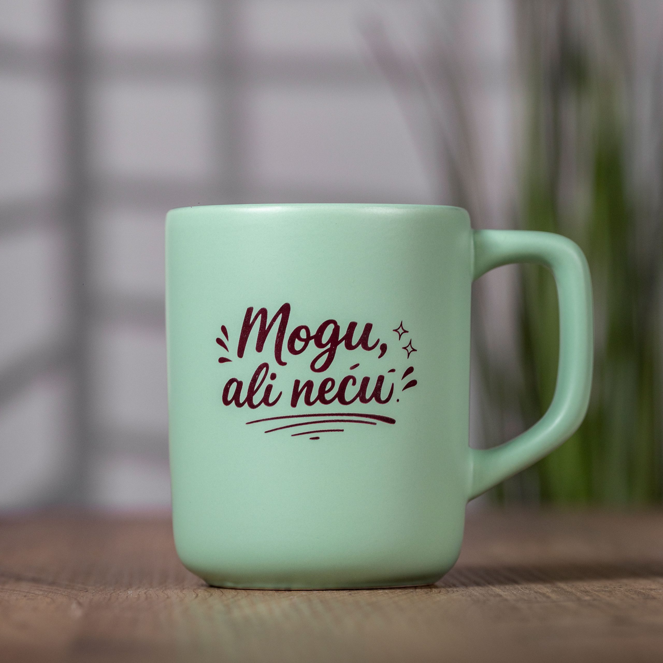 Mat šolja sa natpisom „Mogu, ali neću“, dostupna u zelenoj ili pastel žutoj boji. Idealan izbor za kafu, čaj i kao originalan poklon za sve koji znaju da postave granice. Kvalitetna štampa omogućava dugotrajnu upotrebu, a za očuvanje dizajna preporučuje se ručno pranje.